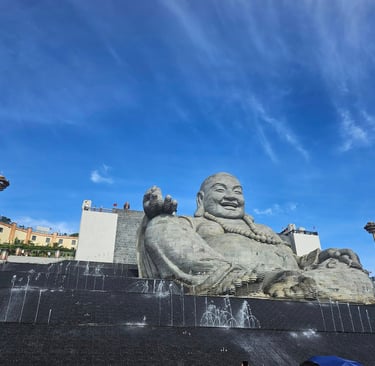 Phía sau lưng và bao quanh tượng Di Lặc Bồ Tát là thác nước nhân tạo khổng lồ cao 35m.